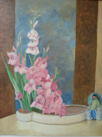 Opstilling med japansk dekoration med lyserød gladiolus.