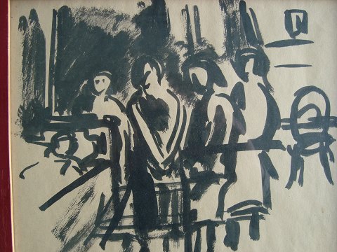 Georg Tscherning-Petersen (1909-94): "Dødsleje" eller "Sygeleje" Tusch/akvarel. Sign.: G.T.P. 46 i bly. 24x28 (26x30)