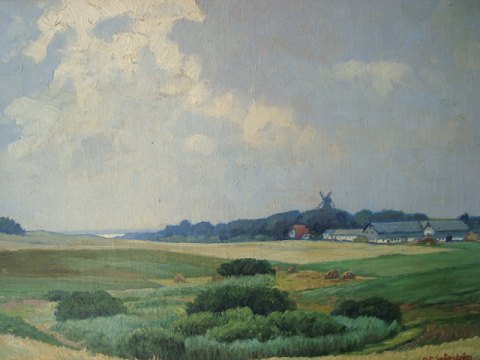 Udsigt mod marker og landbrugsejendom med mølle i baggrunden.
