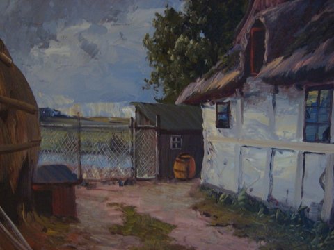 Gustav P. Rimmer (1904-88): Gårdeksteriør med hønsegård. Olie på lærred. Sign.: G.P. Rimmer. 39x49 (51x61)