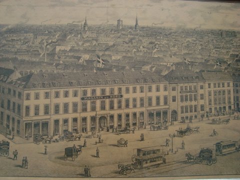 Gammelt tryk i sølvramme. Kongens Nytorv, København med Magasin Du Nord, hestevogne og Sporvogne. Indrammet - 39x60