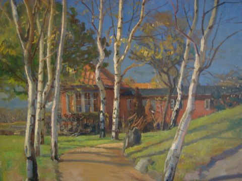 Carl J. Christensen (20 årh): Allé med birketræer op mod rødkalket hus 1940. Olie på lærred. Sign.: Carl J.C. 1940 83x83 (88x88) Et meget spændende maleri med et godt lys og dejlige farver.