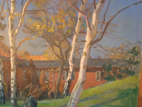 Carl J. Christensen (20 årh): Allé med birketræer op mod rødkalket hus 1940. Olie på lærred. Sign.: Carl J.C. 1940 83x83 (88x88) Et meget spændende maleri med et godt lys og dejlige farver.
