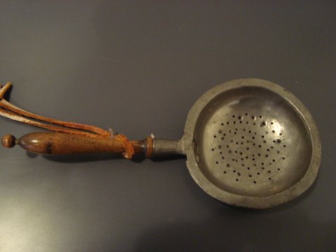 Antik tesi (19 årh): Tin med drejet træhåndtag. Længde i alt - 18 cm.