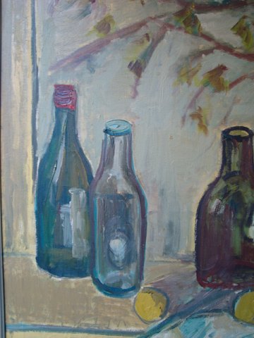 Opstilling på karm med flasker, blomsterløg og frugt - 1973.