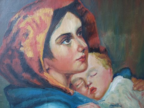 Ubekendt kunstner (20 årh): Madonnina - Gadernes Madonna 1923. Efter maleri af Roberto Ferruzzi fra 1897. Olie på lærred. Sign.: Mészáros .... 1923 68x50 (76x58)