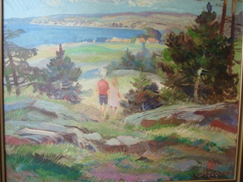 Nis Stougaard (1906-87): Kystparti fra Bornholm med 2 børn der kigger ud over havet. Olie på lærred. 53x65 (62x74)