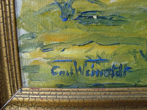 Carl Weinoldt (20 årh): Parti fra Pæstum, Italien. Olie på lærred - nyrenset. Sign.: Carl Weinoldt Bapå blindramme betegnet - Præstum, Italien. 32x30 (36x38) Smukt maleri med skønne friske farver.