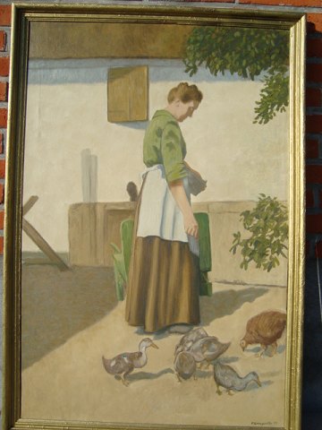 Gårdeksteriør med kone der fodre høns og ænder 1933.