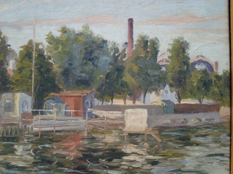 Ubekendt kunstner (20 årh): Kystparti med huse og både i havn - Nordsjælland?? Olie på lærred. Sign.: AL.P. (??)(se foto) Dateret - 19?? 32x44 (46x57)
