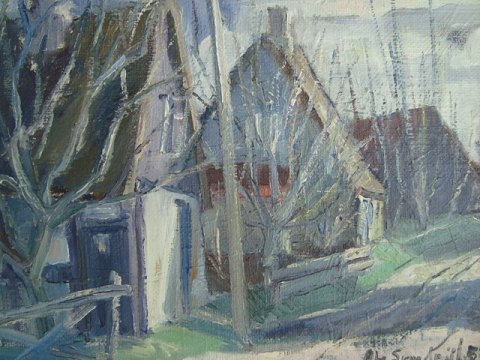Ole Sværdpiil (1914-80): Vej gennem landsby - antagelig på Mols. Olie på lærred. Sign.: Ole Sværdpiil - 57. 24x32 (31x39)