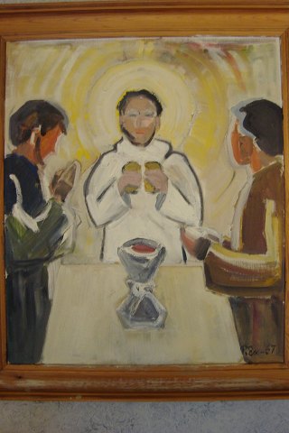 Poul Exner (født 1929): "Jesus i Emmaus" - 1967. Olie på lærred. Sign.: P. Ex - 67. Bagpå betegnet - Emmaus. Bagpå signeret - Poul Exner 1967. 66x56 (77x67)
