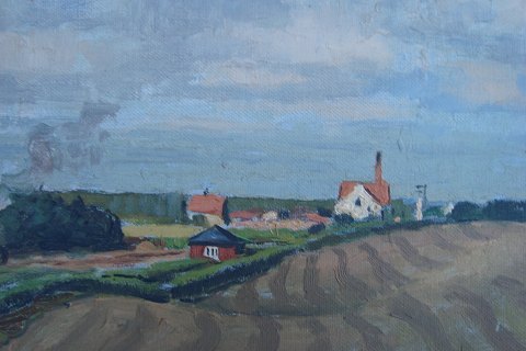 Aage Lundgreen (1886-1957): Landsby med mejeri i landskab. Olie på plade. Sign.: Aage Lundgreen Bagpå betegnet - A. Lundgreen privateje. 22x28 (29x35)