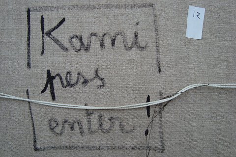 Franck Thierry (født 1961): Komposition med person 1991. Titel - Kami Press Enter! Olie på lærred. Sign.: Franck Thierry 91(bagpå lærred) Bagpå også udstillingsnummer - 12. 65x54 (67x57)