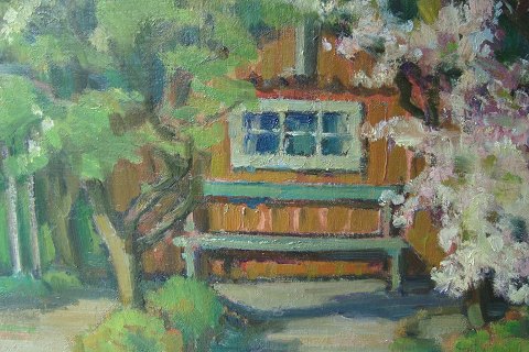 Eiler Løndal (1887-1971): Haveparti med hus, bænk og blomstrende frugttræer 1949. Olie på lærred. Sign.: Eiler Løndal - 49. 48x60 (51x63)