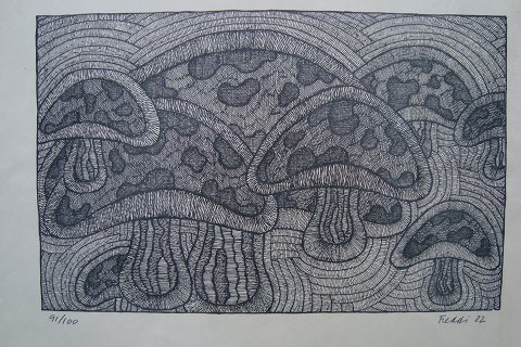 Ubekendt kunstner (20 årh): Kompsition med svampe. Træsnit på papir 1982. Sign.: Freddi - 82. (Én for mig ubekendt kunstner). Nummer - 91/100. Indrammet i aluramme (30x40)