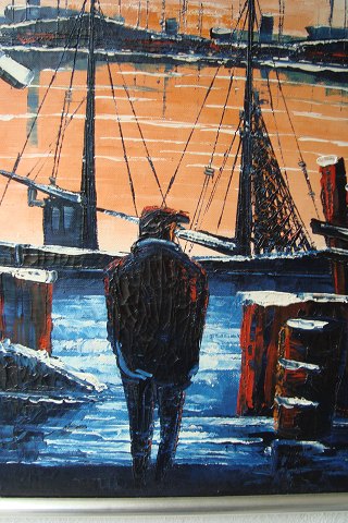 Svend Nielsen (1908-93): Aftenparti fra havnen med person. Indrammet i sølvramme. Olie på lærred. Sign.: Svend Nielsen 60x77 (64x79)