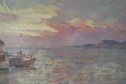 Ubekendt kunstner (20 årh): Fiskerhuse, Bohuslän i Sverige. Olie på lærred - nyrenset. Sign.: Utydelig signeret. 45x66 (62x82) Et virkeligt dejligt og gennemarbejdet maleri med et smukt lyserødt lys