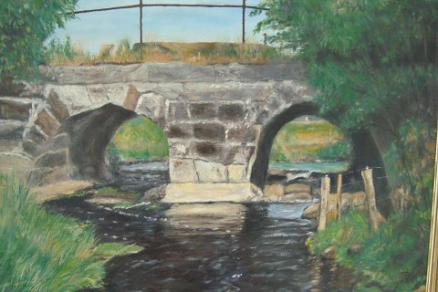 Ubekendt kunstner (20 årh): Gejlå Bro ved Bommerlund Plantage. Olie på lærred. Sign.: Monogram JR 52x68 (63x78) Et virkeligt dejligt og spændende maleri af, en af mig, ubekendt kunstner.