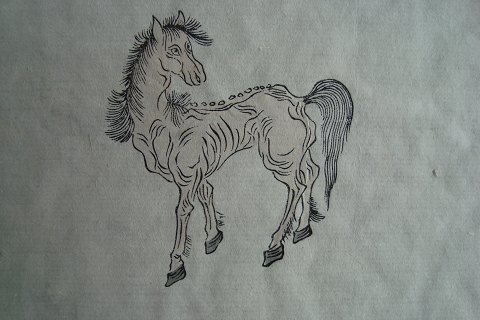 Shizhu Zhaijianpo: Mager Hest 1952 Koloreret træsnit på papir. Signeret. 17x12 (29x20)
