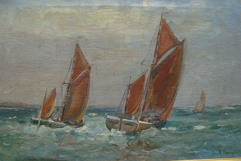 Ubekendt kunstner (20 årh): Sejlskibe på åbent hav. Olie på lærred. Sign.: V.Bang.C. 32x48 (41x57)