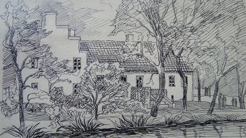 Karen Palsgaard (1882-1965): Herregården "Junget" 1950. Tusch på papir. Sign.: KP 1950 Betegnet - Herregaarden "Junget". 20x22 (22x24)