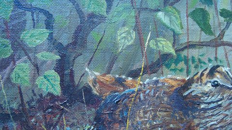 Ubekendt kunstner (20 årh): Skovsneppe på rede. Olie på lærred. Usigneret. 24x30 (31x37) Et meget spændende maleri - rigt detaljeret med græs, grene, blade og ikke mindst fuglen - en skov sneppe.