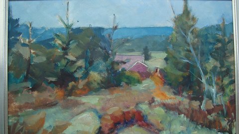 Poul Bruun-Jacobsen (1922-2010): Gård i landskab 1976. Olie på plade. Sign.: Jacob 76. 40x58 (48x66)