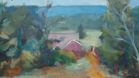 Poul Bruun-Jacobsen (1922-2010): Gård i landskab 1976. Olie på plade. Sign.: Jacob 76. 40x58 (48x66)