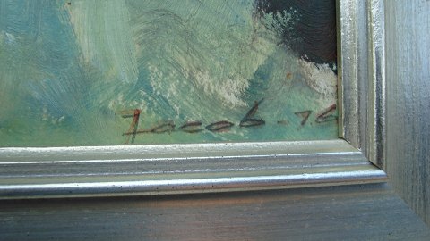 Poul Bruun-Jacobsen (1922-2010): Gård i landskab 1976. Olie på plade. Sign.: Jacob 76. 40x58 (48x66)