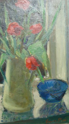 Opstilling med blomster og ymerskål i vindue 1948.