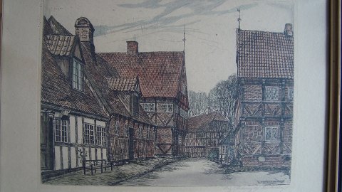 Leo Houlberg (1896-1950): Fra "Den Gamle By" i Århus. Farveradering på papir. Sign.: Leo Houlberg (i trykket) Betegnet med bly - Original Radering af Leo Houlberg. Indrammet (53x63)
