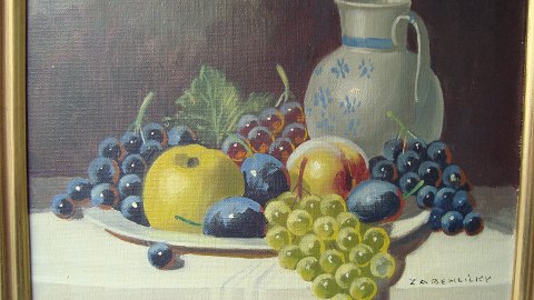 Ubekendt kunstner (20 årh): Opstilling på bord med hvid dug - frugtfad og rhinsk vinkande. Olie på lærred. Sign.: Zabemcicky 23x28 (32x37)