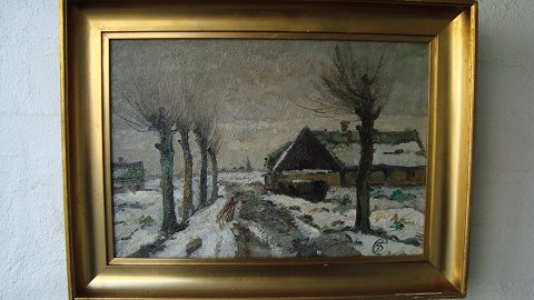 Jens Sinding Christensen (1888-1980): Vej gennem landsby med stynede popler, vinter - Mølle i baggrunden. Olie på lærred. Nyrenset. Sign.: JSC (Monogram) 25x36 (32x43)