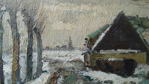 Jens Sinding Christensen (1888-1980): Vej gennem landsby med stynede popler, vinter - Mølle i baggrunden. Olie på lærred. Nyrenset. Sign.: JSC (Monogram) 25x36 (32x43)
