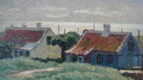 Hans Kruuse (1893-1964): Klitparti fra Skagen med vue ud over huse. Olie på lærred Nyrenset. Sign.: H. Kruuse Messingskilt - Hans Kruuse. 38x50 (49x61)