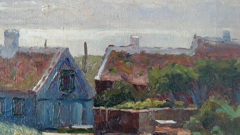 Hans Kruuse (1893-1964): Klitparti fra Skagen med vue ud over huse. Olie på lærred Nyrenset. Sign.: H. Kruuse Messingskilt - Hans Kruuse. 38x50 (49x61)