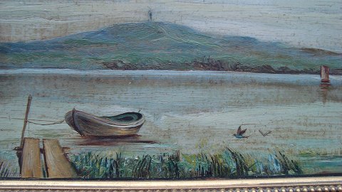 Skibe på søerne ved Silkeborg med Himmelbjerget i baggrunden.