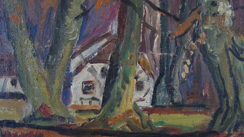 Ubekendt kunstner (20 årh): Hus i skov, efterår. Olie på lærred. Sign.: Solveig ?? 46x60 (52x66)
