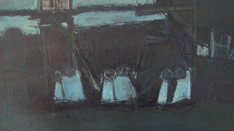 Ubekendt kunstner (20 årh): Hus i blå skumring 1958. Pastel mv på papir. Sign.: Utydelig signeret (en for mig ubekendt signatur)1958. Indrammet uden glas. Spændende billede. 43x55 (60x72)