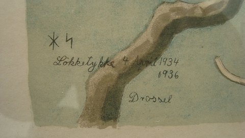 Hjalte Skovgaard (1899-1967): Drossel på gren. Tryk på papir. Betegnet - Lökketykke 4. april 1934-1936 - Drossel. Sign.: Rune signatur Indrammet - 34x31