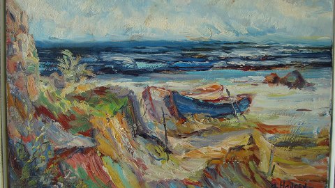 Alex Hansen (født 1947): Kystparti med optrukne både på stranden. Akryl på lærred. Indrammet i svæveramme. Sign.: A. Hansen. 40x50 (44x54)