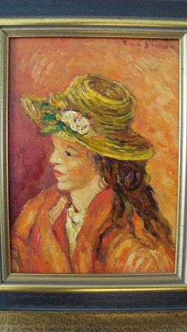 Eug. Simon (20 årh): Pige med stråhat. Olie på plade. Kopi efter Pierre Auguste Renoir (1841-1919) Sign.: Eug. Simon. 20x15 (33x28)