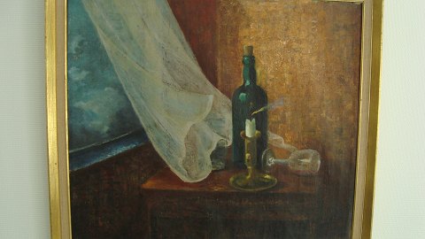 W. Draggard (20 årh): Opstilling på bord ved blafrende gardiner 1963. Olie på lærred. Sign.: Draggard (Utydeligt) Bagpå label - Nr. 2 "Interiør" - "Foreningen for Dyrehavens malere 1963" 60x70 (68x78)