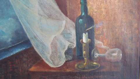W. Draggard (20 årh): Opstilling på bord ved blafrende gardiner 1963. Olie på lærred. Sign.: Draggard (Utydeligt) Bagpå label - Nr. 2 "Interiør" - "Foreningen for Dyrehavens malere 1963" 60x70 (68x78)