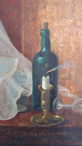W. Draggard (20 årh): Opstilling på bord ved blafrende gardiner 1963. Olie på lærred. Sign.: Draggard (Utydeligt) Bagpå label - Nr. 2 "Interiør" - "Foreningen for Dyrehavens malere 1963" 60x70 (68x78)