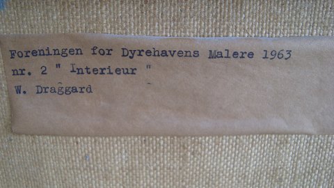 W. Draggard (20 årh): Opstilling på bord ved blafrende gardiner 1963. Olie på lærred. Sign.: Draggard (Utydeligt) Bagpå label - Nr. 2 "Interiør" - "Foreningen for Dyrehavens malere 1963" 60x70 (68x78)