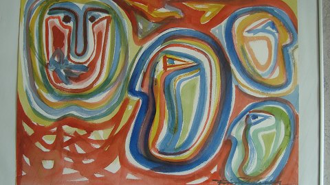 Finn Pedersen (1944-2014): Komposition af fantasivæsner (Spunks) og ansigter. Akvarel på papir. Sign.: Finn Pedersen. 36x51 (61x51) Glas med lille defekt.