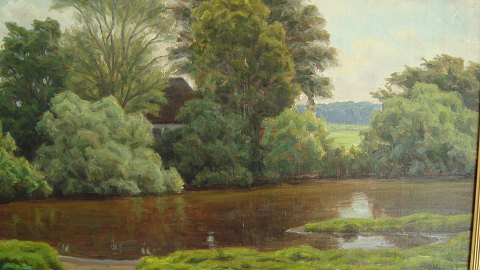 Henrik Jespersen (1853-1936): Landskab med sø. Olie på lærred. Sign.: Henrik J. 52x77 (68x93) Henrik Gamst Jespersen var elev af Vilhelm Kyhn og gik på Kunstakademiet i København 1879-82. 16213