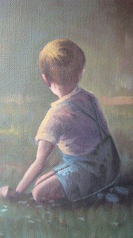 Ubekendt kunstner (20 årh): Dreng plukker blomster i landskab. Olie på lærred. Sign.: Jenny 42x33 (57x49)